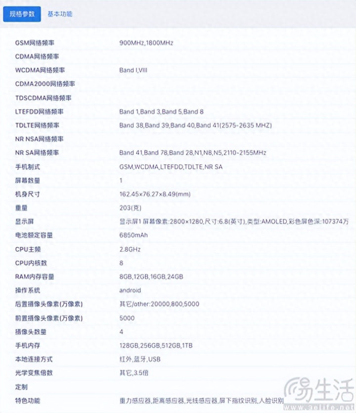 电信终端设备网公布的信息显示,RMX5130将采用一块2800×1280分辨率的6.8英寸AMOLED屏幕,并提供最高24GB+1TB的存储组合,提供6850mAh电池,影像方面配备5000万像素前摄,以及由2亿像素主摄+800万像素超广角+5000万像素长焦组成的后置三摄模组。其机身尺寸为162.45×76.27×8.49mm,重量则是203g。
