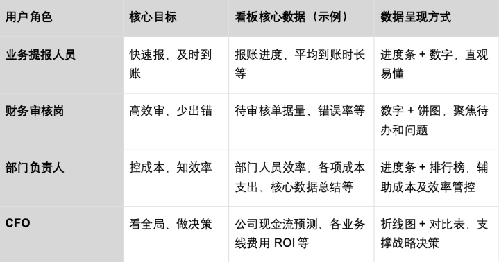 根据不同用户角色(业务、财务、管理层)的数据需求,设计不同数据看板。