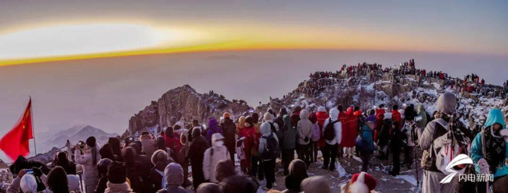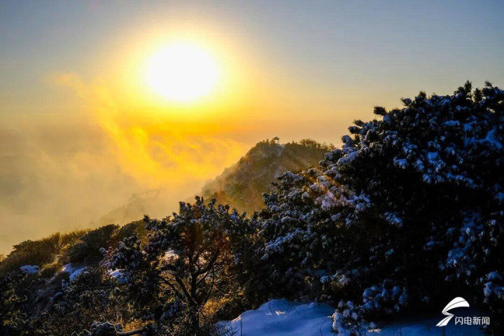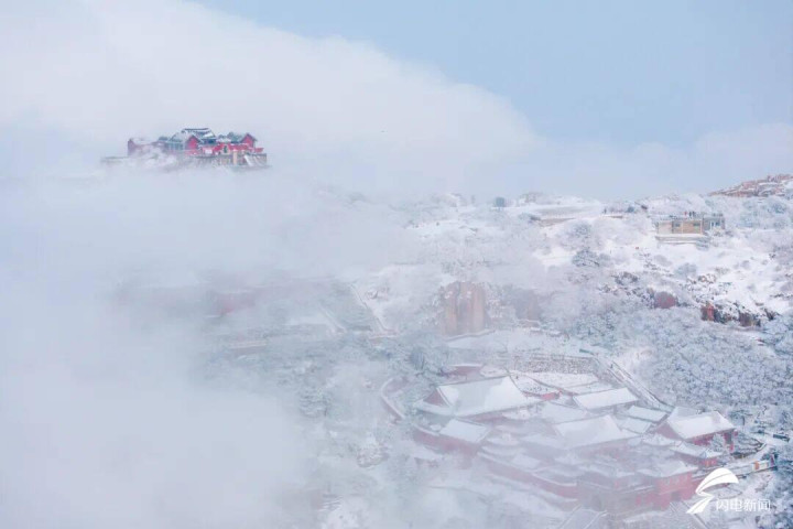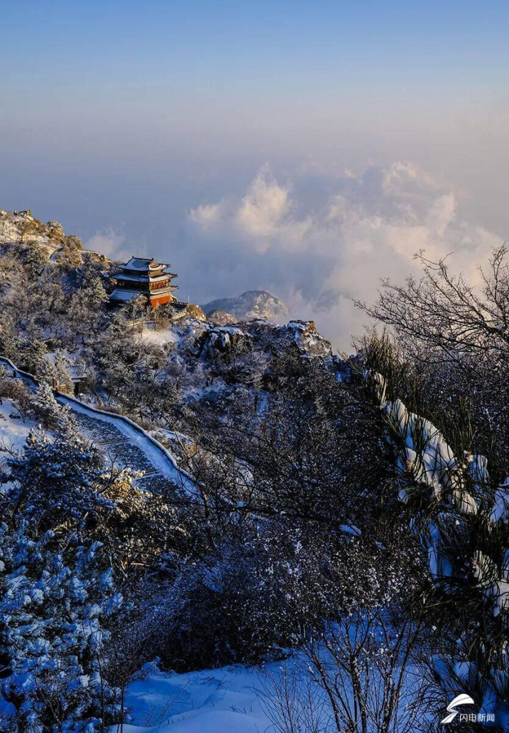 登山的游人放慢了脚步,有人伸手轻接飘落的雪花,有人举着相机定格这难得的盛景,欢声笑语在雪色里漾开,与山间的云雾交织成一首灵动的冬日恋歌。极目远眺,云海翻涌间,银峰如簇,琼楼若隐若现。